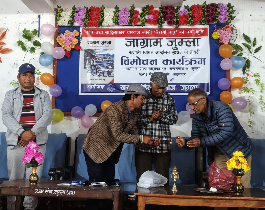 जुम्लाको चन्दननाथ नगरपालिका वडा नम्बर ५ कार्कीवाडा निवासी यमराज कार्की -बैरागी बाबु) ले आफ्नो नयाँ कृति ‘जाग्राम जुम्ला’ सार्वजनिक गर्नुभएको छ । कर्णाली प्रदेश स्थापनाका लागि भएको ऐतिहासिक आन्दोलनलाई समेटेर तयार पारिएको उक्त पुस्तक आइतबार एक विशेष समारोहका बीच विमोचन गरिएको हो । विमोचन कार्यक्रममा विभिन्न क्षेत्रका बुद्धिजीवी, समाजसेवी, विद्यार्थी तथा स्थानीयवासीहरूको उल्लेख्य उपस्थिति रहेको थियो ।